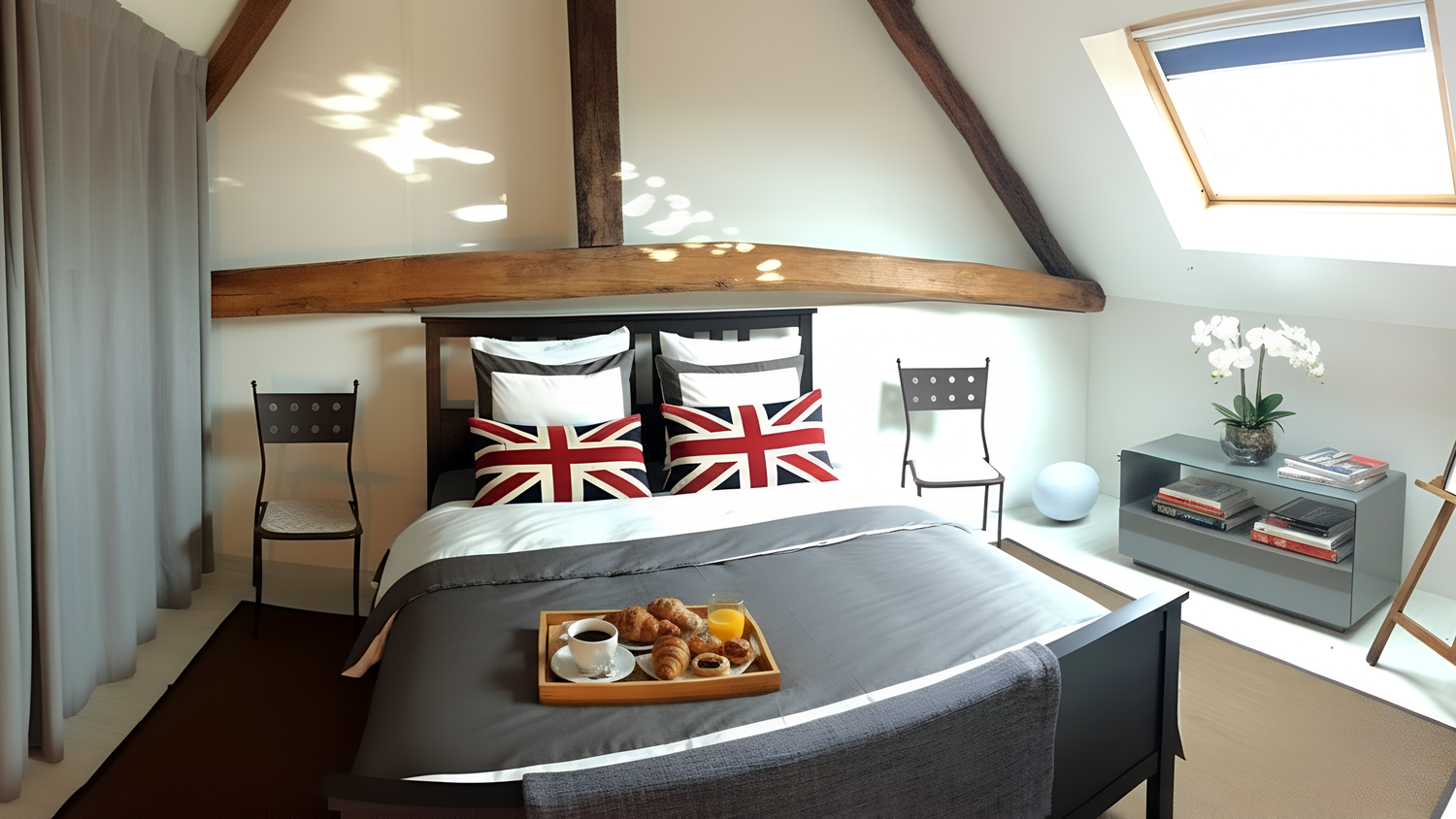 TWO QUEEN-SIZED BEDS WITH LUXURY BEDDING AWAIT, SET TO THE RIGHT OF THE BATHROOM, AMONGST THE BEAUTIFULLY RESTORED, ORIGINAL 1850s OAK-BEAMS.