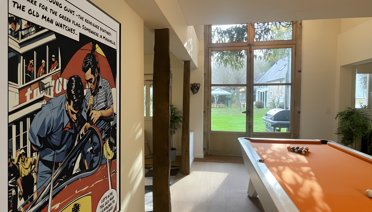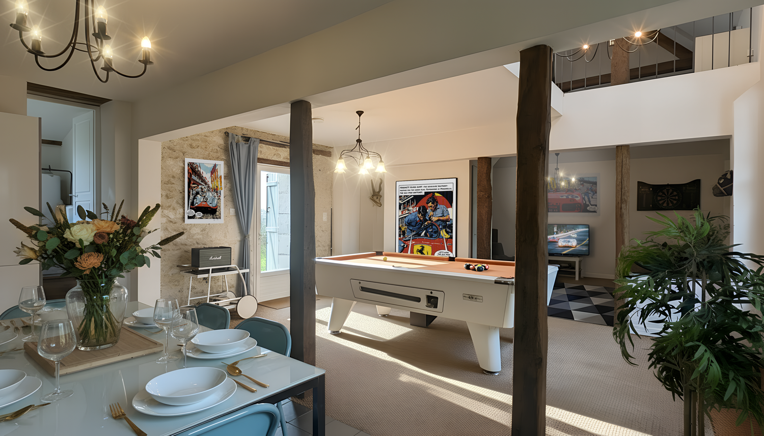 AN OPEN-PLAN GROUND FLOOR WITH MODERN KITCHEN AND LOUNGE SEPARATED BY AN AMERICAN POOL TABLE.
